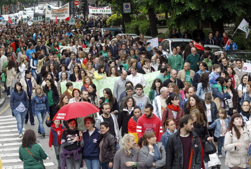 Fue una marcha verde, el color de la escuela pública que nació en Madrid contra los recortes de Esperanza Aguirre, formada por más de 7.000 personas según las fuerzas de seguridad que custodiaban la plaza de España, sede de la Delegación del Gobierno y de la Consejería de Educación y Universidades, y por alrededor de 15.000 según los cinco sindicatos convocantes, exultantes ante el éxito de la convocatoria que se repitió en las principales ciudades del país. Pocas con tanta mecha dispuesta a prender como Asturias el pulso educativo al Ejecutivo de Rajoy. «¡Mariano: con estos recortes, no llegas al verano!». El propio Gobierno central había reconocido, poco antes, que el Principado, junto con Aragón y Navarra, había registrado el seguimiento «más acusado» de la jornada de huelga en el sector educativo, la primera de una primavera que se presenta más que «caliente» en las aulas. Un 40%, frente al 19,41% de la media nacional.
